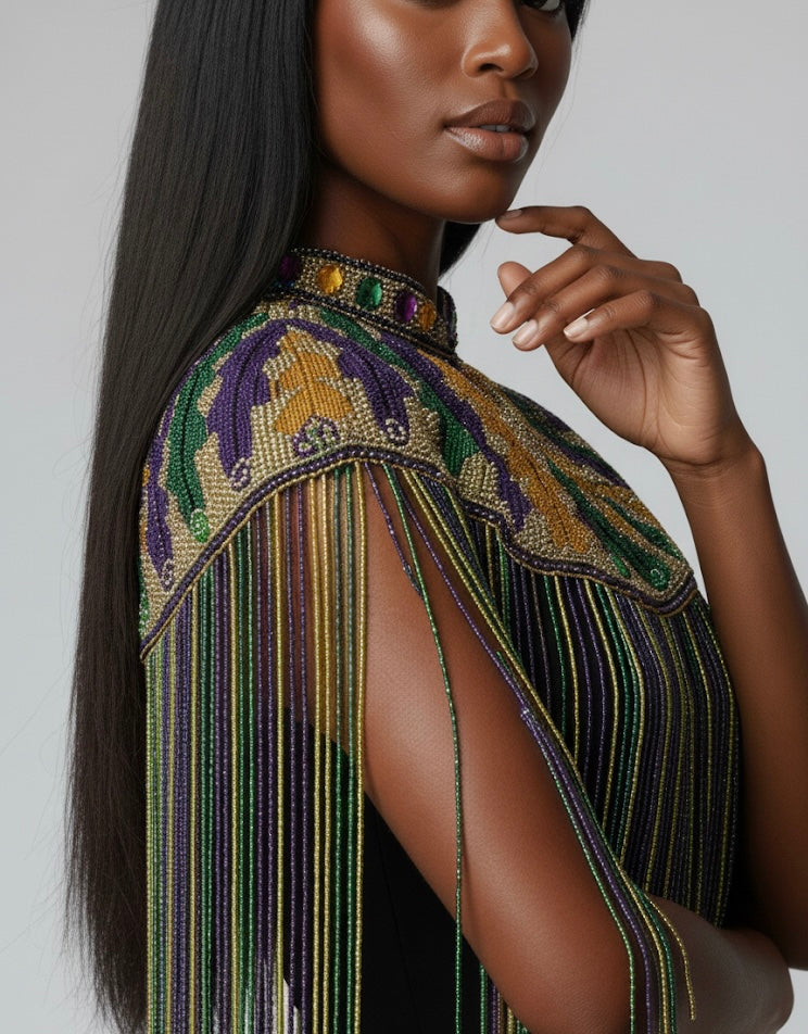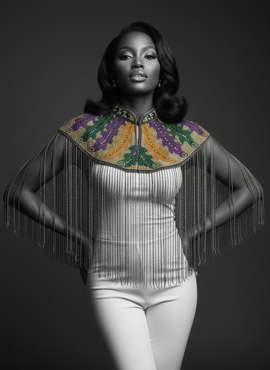 L’Jai Amor is a luxury fashion brand specializing in hand-beaded capes and statement designs that merge structure, movement, and cultural influence.