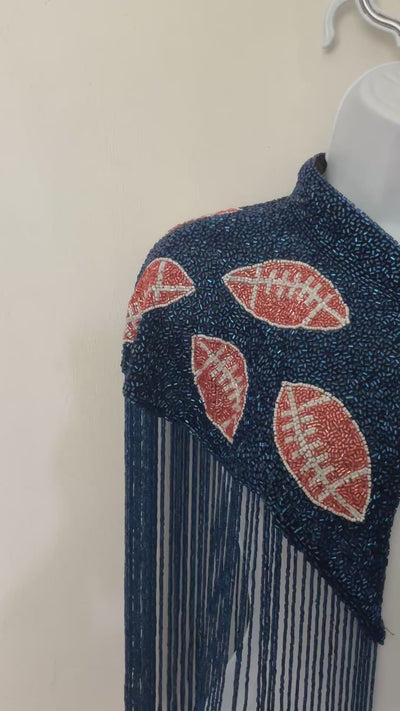 Indulge in game day chic with our bright opulent high neck hand-beased cape, adorned with luxurious orange crystal fringe trimming with orange footballs all over front and back. Universally flattering, this statement piece is designed to fit all sizes effortlessly.